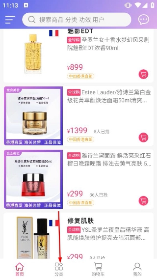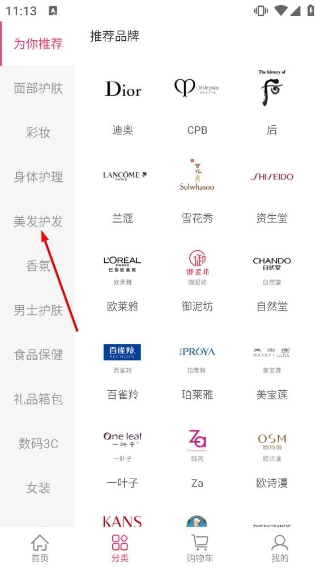 打开软件后,找到并点击分类选项,进入商品分类页面,即可查看各类美妆护肤相关分类。