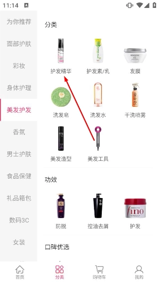 在美发护发的细分页面里,找到并点击“护发精华”选项,进入这类商品的列表页面后,浏览相关产品。