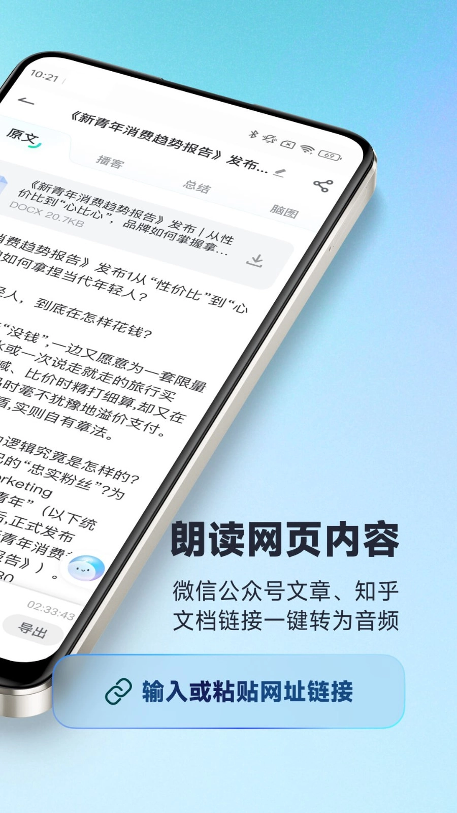 只需输入网页链接,就能朗读网页内容;新闻、微信公众号文章、知乎、腾讯文档、飞书文档等链接,都能一键转换成音频。
