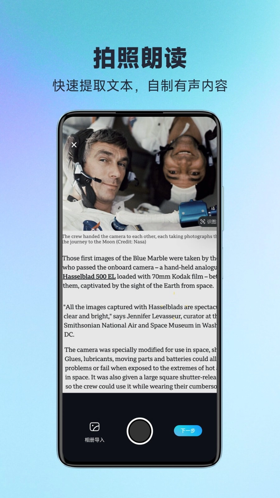 拍照后能快速扫描并提取图片上的文字,还支持一键朗读功能。