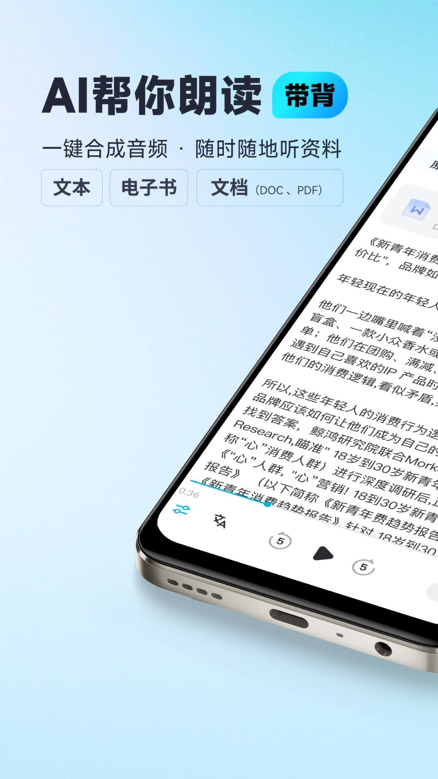支持用户将上传的PDF、DOC文档以及电子书一键转换为音频,轻松自制专属有声读物。