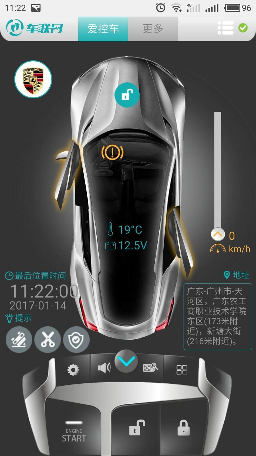 状态:呈现车辆实时的行驶速度、所处位置,以及设防、撤防状态、启动状态、车门开关状态,同时还包含各类报警提示信息。