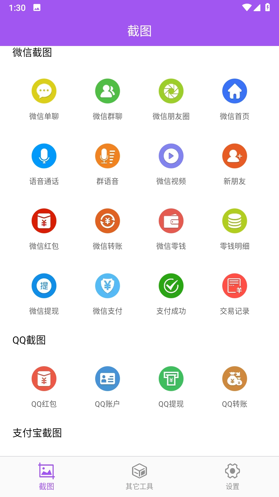 截图功能:可制作微信、QQ、支付宝等社交平台的截图,覆盖单聊、群聊、红包、转账等多种场景。