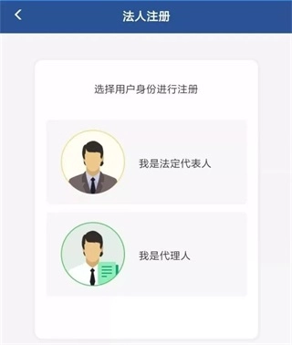 二、依据注册用户的身份,选择“我是法定代表人”或者“我是代理人”(此处以法定代表人为示例)