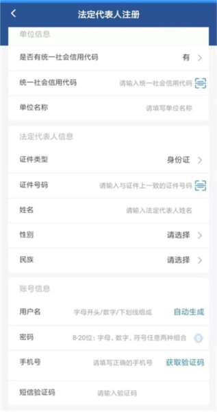 三、依据要求完成信息填报,包括单位信息、法定代表人信息和账号信息。若选择以“我是代理人”身份注册,还需填写代理人的相关信息。