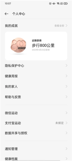 同时点击头像,我们还能在此查看你的成就、健康周报,以及添加家人的运动信息。