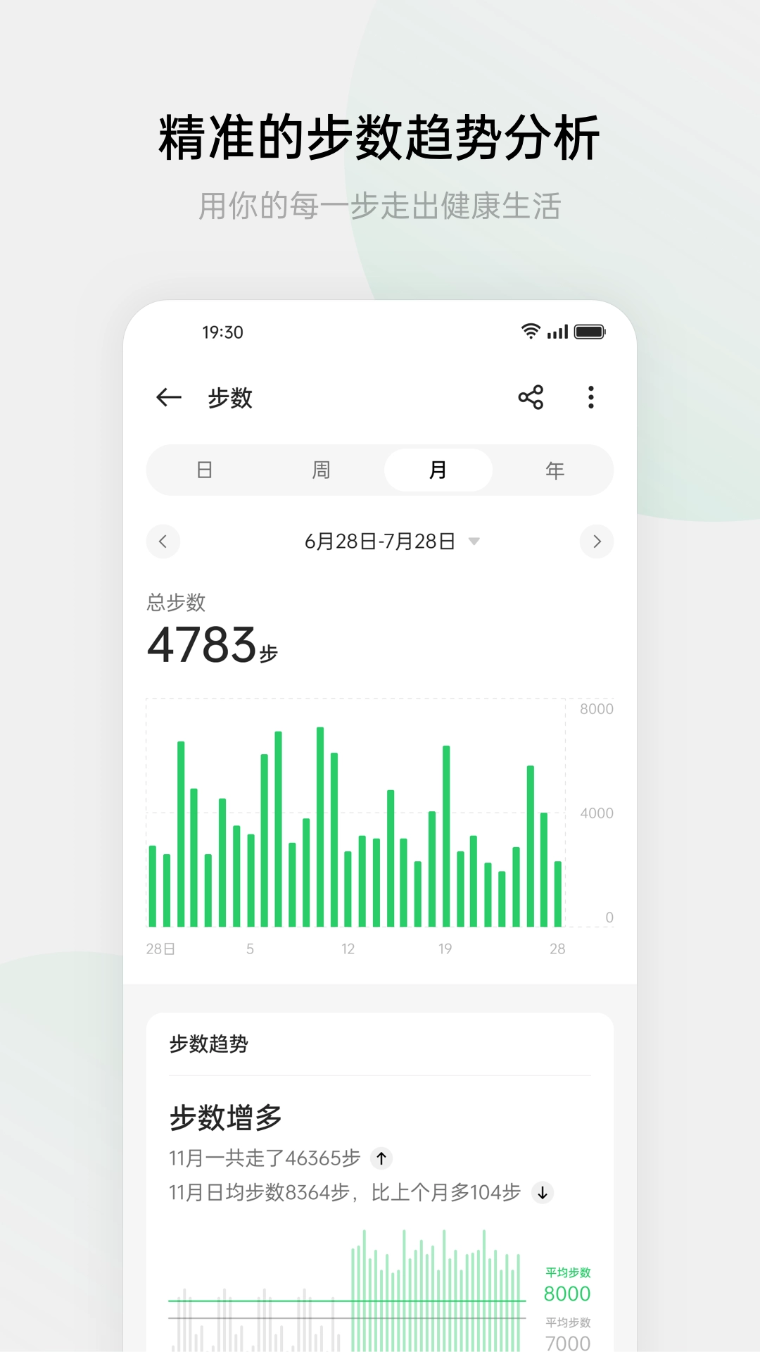 【精准步数记录功能】深度融合手机特性,为你实现全天候精准步数统计,支持同步至微信、支付宝等第三方平台,助力提升你的运动排行。