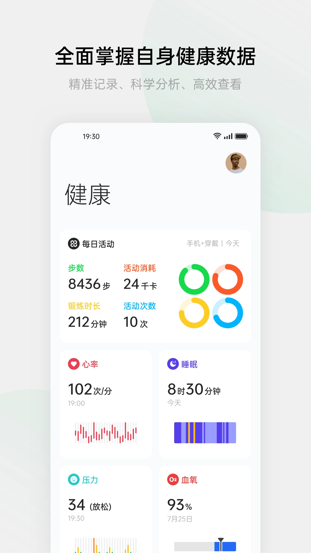 【全方位健康数据呈现】搭配穿戴设备,可获取完整的每日活动数据、科学的睡眠质量分析数据以及丰富的运动记录数据等,让你的健康状况数据直观可见。