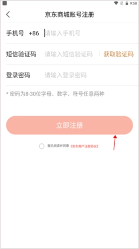 请输入您的手机号与验证码,设置登录密码,勾选下方的京东用户注册协议,然后点击“立即注册”按钮完成注册流程。