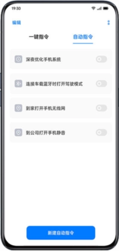 系统已预先设置了若干常用指令,包括:在深夜对手机系统进行优化;当连接车载蓝牙时开启驾驶模式;回到家后打开手机无线网络;抵达公司后将手机调至静音状态。
