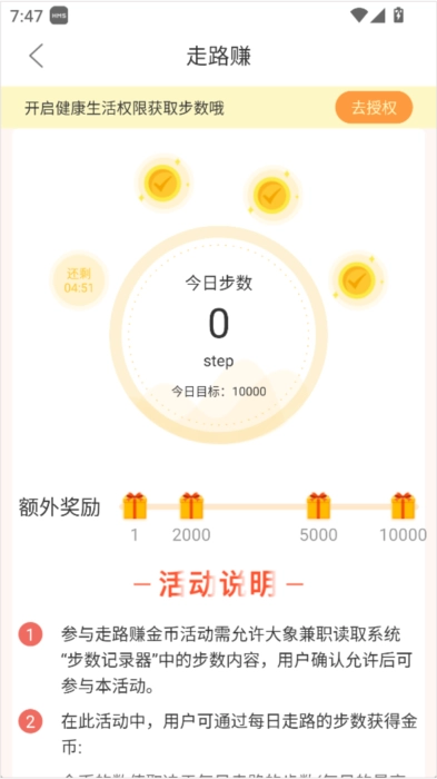 实时走路就能赚钱,系统会统计你每天的行走步数,只要达到设定的步数目标,就能马上领取奖励。