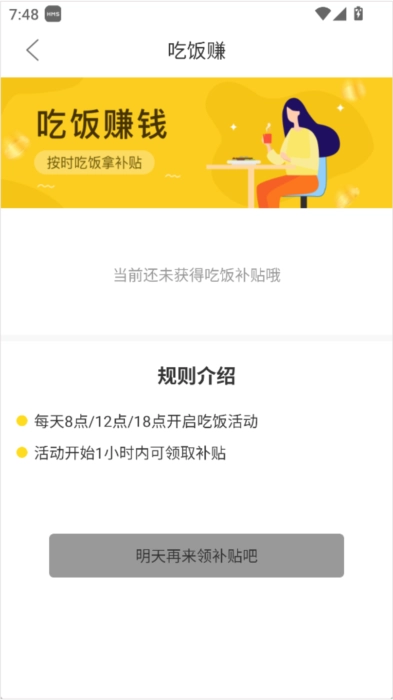 吃饭也能赚,每天的三餐都有吃饭活动,只要动动手指就能领取补贴哦。