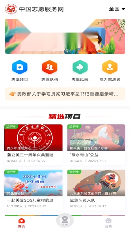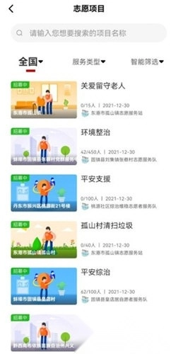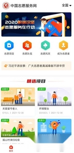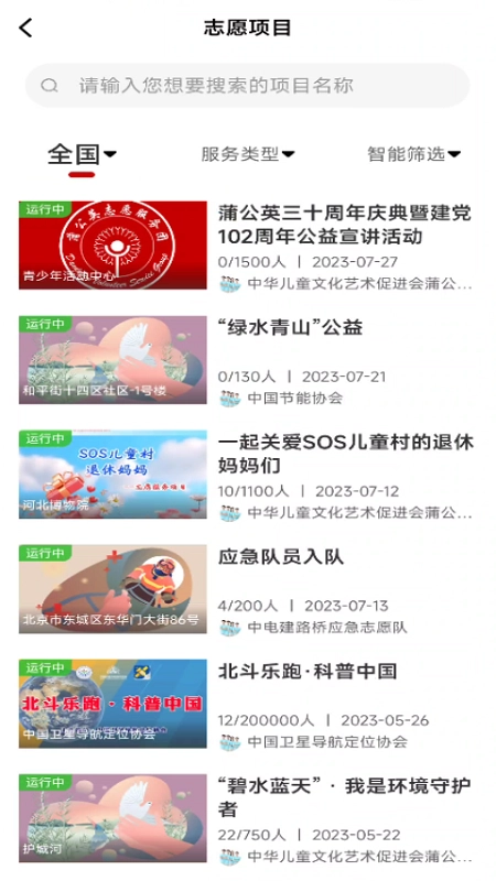 项目搜索:在中国志愿平台查找近期的志愿项目,可随时报名参与志愿活动。