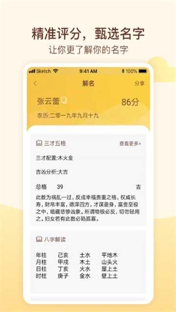 【全方位名字解析】名字评分、姓名评分、姓名深度解读、八字命理分析、五格三才剖析、周易八卦阐释、字音声调解析、字形结构解析,深入挖掘名字背后的深层寓意,实现对名字的全面解析。起名取名大全软件融合易经命理、三才五格理论,以及古文诗词曲赋的文学底蕴,助力您解析名字所蕴含的五行八字与命理命格。
