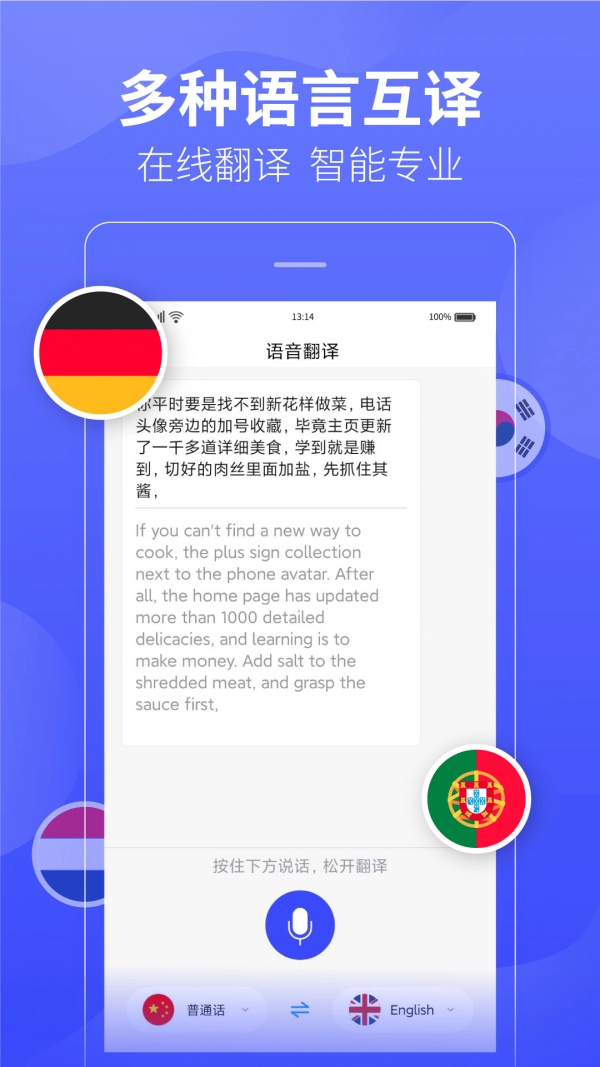 在线实时翻译、多语种互译,专业又智能!让语音翻译更简单,从此告别语言不通的烦恼:支持翻译录音、翻译软件、英语翻译、语音翻译、在线翻译、语言翻译器、对话翻译,以及中英、日语、韩语、泰语等多种语言翻译。