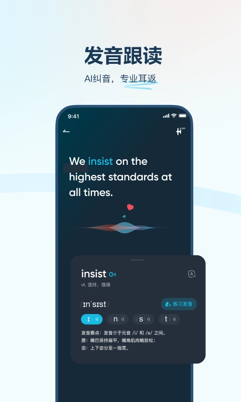 一键跟读功能:借助AI实时智能纠音技术,搭配专业耳返效果,让口语练习效率显著提升。