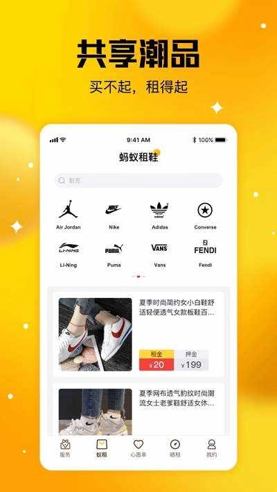 蚂蚁租鞋是一个围绕球鞋、潮玩与潮流生活构建的社区。在这里,你可以和数万名潮流达人一同分享、发现从经典到流行的各类风格。通过蚂蚁租鞋,你能了解到来自球鞋、潮流与时尚领域的数万名意见领袖的风格、品味,以及他们近期关注的潮流趋势。主动分享你的个人品味,很快你也能成为这个平台上的一员。蚂蚁租鞋致力于通过专业的品质检验服务,为用户提供“租赁品质保障”的差异化价值。平台开创了“先品检、再发货”的租赁模式,通过“多道品质检验工序”以及引入个人商家入驻等方式,确保用户在蚂蚁租鞋享受到经品质检验无瑕疵的租赁服务。自成立以来,平台已累计鉴别超100万件租赁物品。无论你是装备达人,还是球鞋小白,都快来蚂蚁租鞋体验吧!