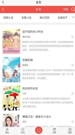 精选、男生、女生、图书四大版块,重磅推荐、人气小说两大分区,