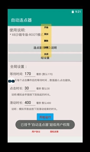 沙箱必须开ROOT,并给自动连点器ROOT权限