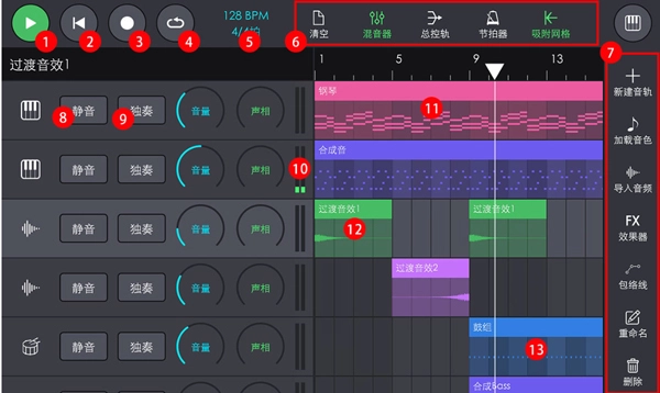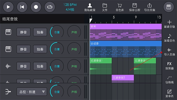 点击左侧的鼓按钮能够预览鼓的音色,长按该按钮则可以对对应的鼓轨执行加载音色、导入音频、调节音量与声相以及删除等操作。