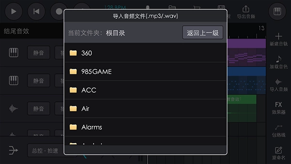 用户新建一条音频音轨时,同样会弹出导入音频框(若暂时不想导入可忽略该弹窗,之后点击“加载音色”来调用音色包里的音频文件)。操作流程为:先点击“返回上一级”找到目标音频文件,直接点击文件即可启动导入流程。需要注意的是:导入完成后软件会自动生成一个与原文件同名的音频数据缓存文件,后续若需再次使用,直接在用户素材音色包中加载该缓存文件即可实现快速导入。