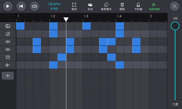 其他操作如写鼓点、框选多选、复制等,与MIDI编辑的操作方式一致,具体可参考“MIDI编辑”部分。在编辑过程中,界面上方的播放控制按钮同样可以使用。完成编辑后,点击右上角的“关闭”按钮即可回到主编曲界面。