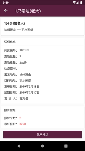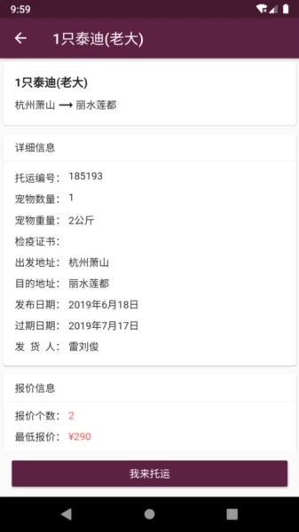 免费发布宠物托运需要,等待宠物托运公司出价通知。