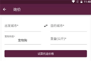 您只需输入出发城市与目的城市,再填写宠物的种类和重量,就能试算出托运价格了。