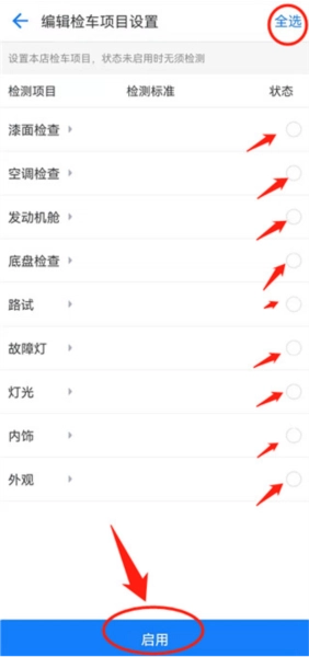 在着手重要事务前,我们得先把检车项目设置这件基础工作做好!具体操作步骤如下:进入超级车店后,依次点击发现、系统管理、检车项目设置,接着点击右上角的选择按钮,根据需求勾选对应的项目,最后在最下方点击启用就完成了。