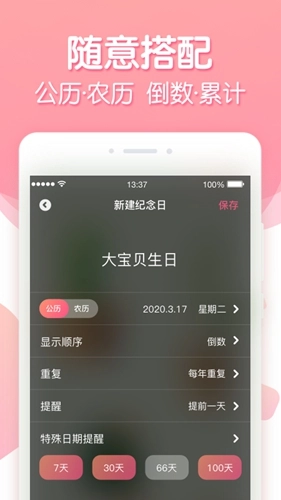 农历设置:支持添加纪念日记录或倒数日提醒,且可选择农历日期进行设置