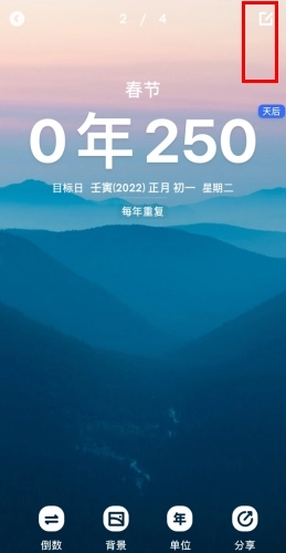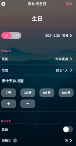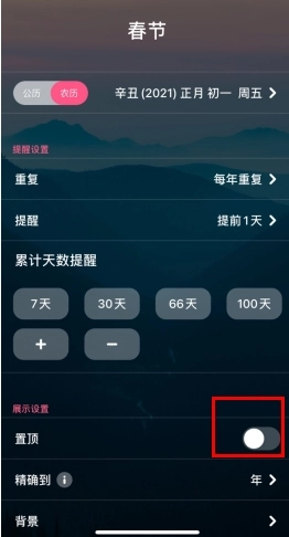当我们设定了重要的日子后,可以将其在倒数纪念日里置顶,这样就能更直观地看到纪念日期了。