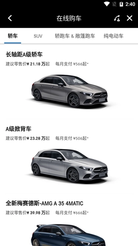 梅赛德斯是梅赛德斯-奔驰(中国)汽车销售有限公司推出的汽车销售及车主服务软件,为用户提供丰富的在线车型选购功能,支持线上预约试驾服务。软件还推出多种灵活的购车方案,用户可根据喜好自由选择。作为奔驰车主享受优质服务的理想选择,该软件始终秉持以客户为中心的服务理念,让广大奔驰车主感受到宾至如归的体验。