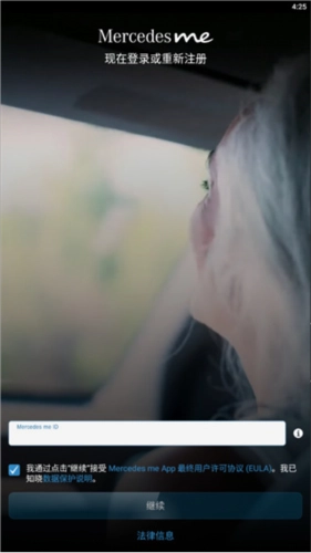 梅赛德斯奔驰应用程序需要通过MercedesmeID进行登录,若未注册则需重新注册。