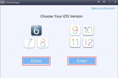 打开AirPlayer后会弹出系统选择界面,用户需依据自身苹果设备的系统版本进行选择。若设备系统为iOS 6、7、8,点击左侧的“Enter”按钮;若系统是iOS 9、10、11、12,则点击右侧的“Enter”按钮。