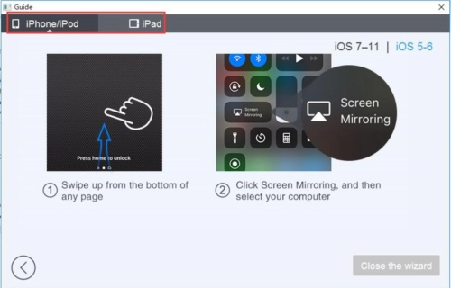 在界面的上方可选择苹果设备的类型(这里以iPhone、iPod为例,iPad也能通过相同方法查看)。比如图中展示的是IOS7-11版本的iPhone或iPod进行投影时所需的操作步骤。