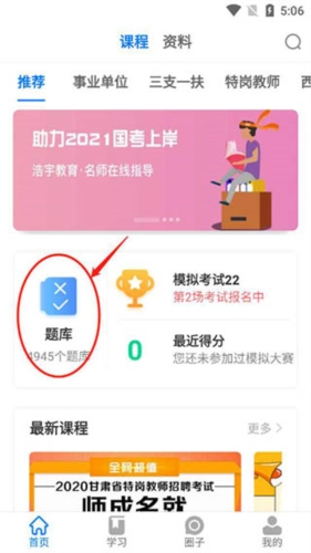 在公考课堂软件首页找到题库按钮,点击进去;